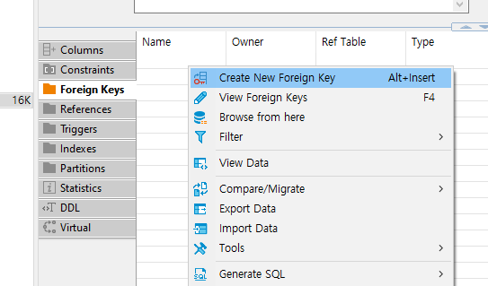 Foreign keys > create new foreign key 클릭