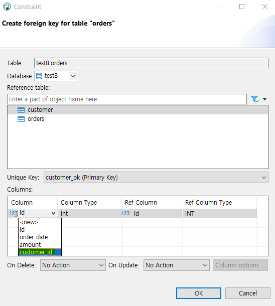 Column - customer_id, Ref Column(참조컬럼) customer테이블의 id 선택