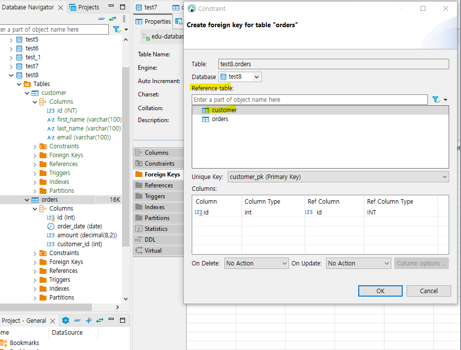 Column - customer_id, Ref Column(참조컬럼) customer테이블의 id 선택