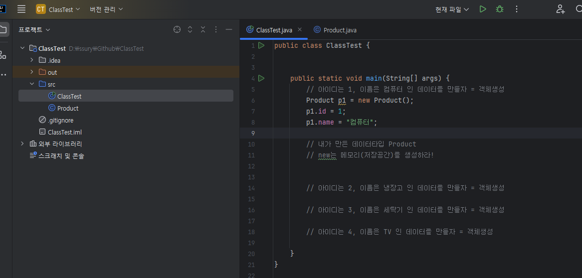 프로덕트의 내용을 저장하는 클래스 Product 와