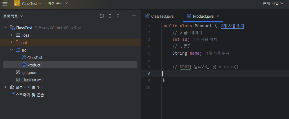 Product 라는 클래스 정보를 찾기위해 scr Product의 class로 점프