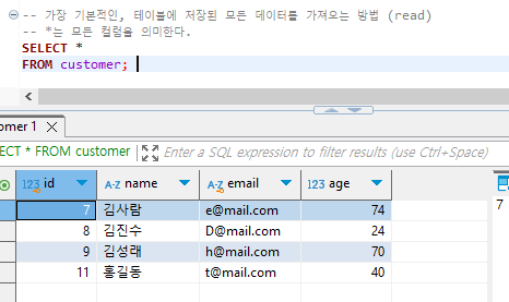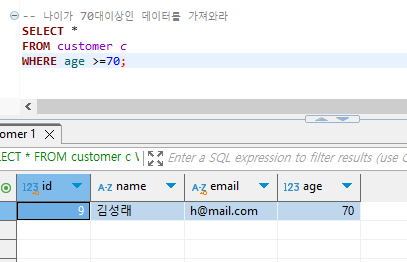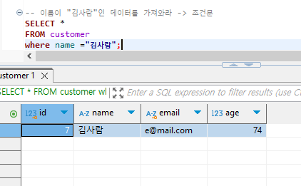 customer에서 이름이 김사람 인 사람만을 조회할 수 있습니다.