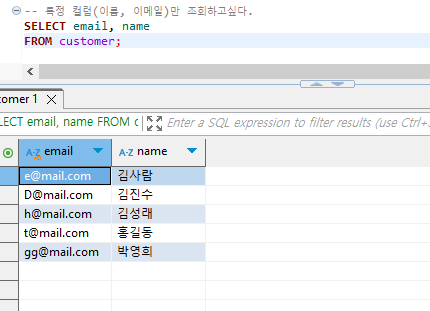custome 테이블의 name, email 컬럼을 불러옵니다.