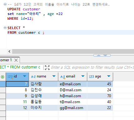 1. 고객테이블의 3. 나이를 45로 변경해라 2. id가 7인 |