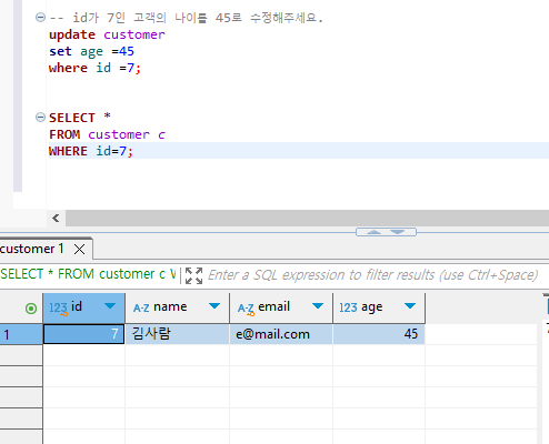 1. 고객테이블의 3. 나이를 45로 변경해라 2. id가 7인 |