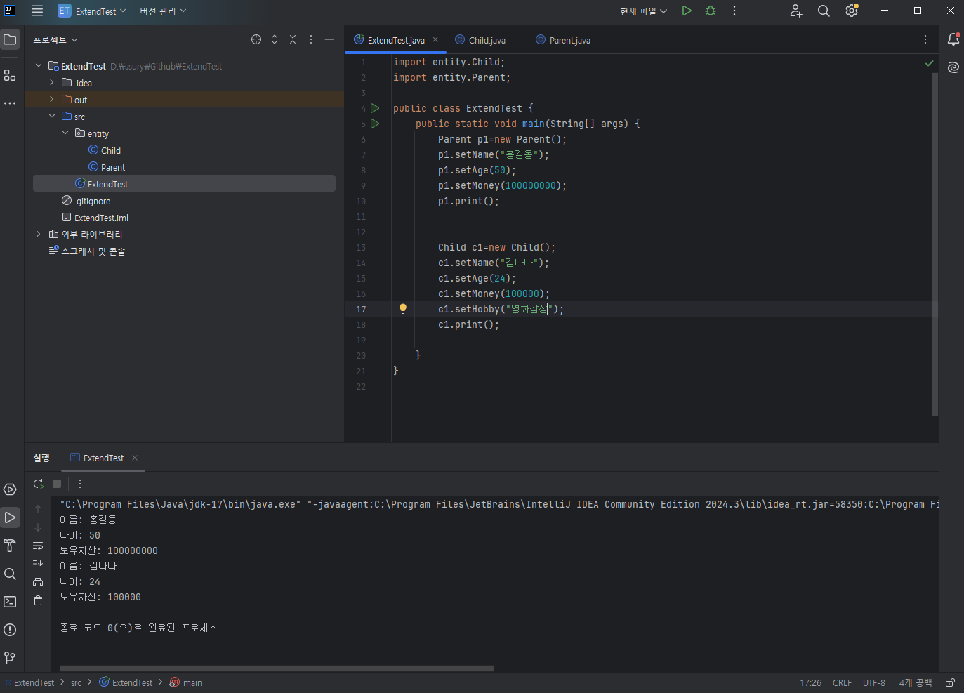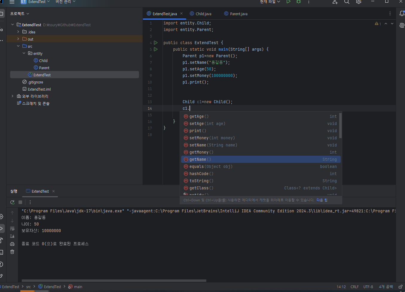 Parent.print();에도 이름, 나이, 보유자산이 있으니 물려받아 쓰고,