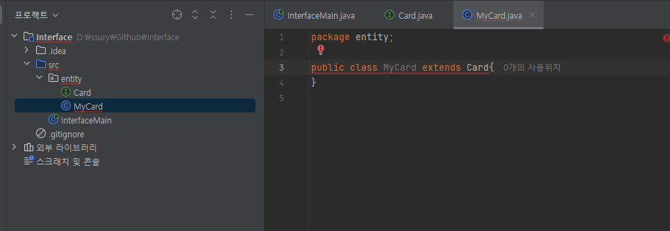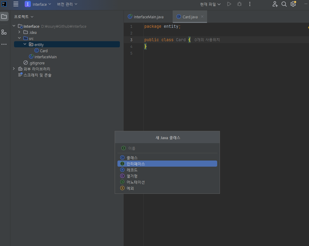 class 대신 insterface라고 입력하여 사용할 수도 있다.