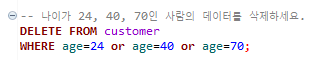 | DELETE FROM customer WHERE age=24 , 40 , 70; |