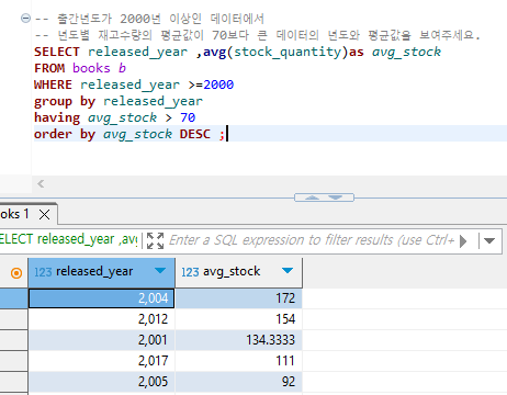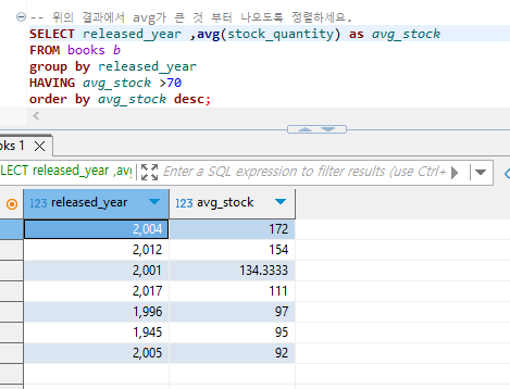 | having avg_stock > 70 | 재고평균값이 70 이상인 |