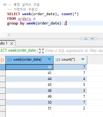 SELECT week(order_date), count(*)
