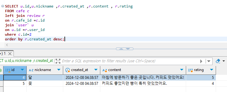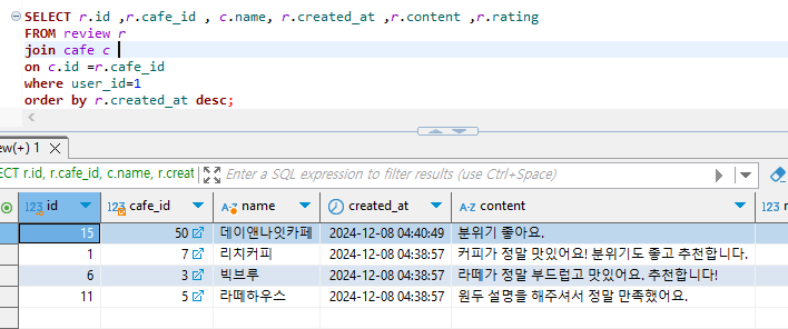 SELECT r.id ,r.cafe_id , c.name, r.created_at ,r.content ,r.rating