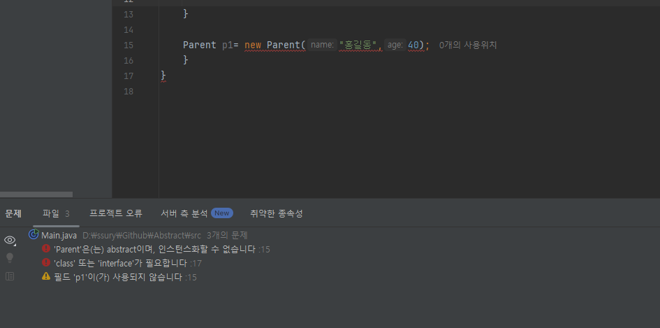- 추상 클래스: abstract 키워드가 클래스 앞에 붙으면 해당 클래스는 추상 클래스가 된다.